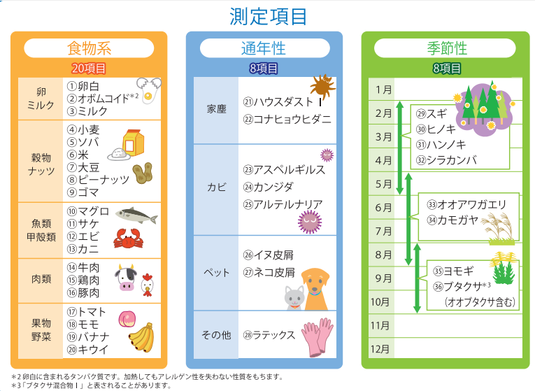 当院ではMAST36という、1度に下記36項目のアレルゲンを調べることができる検査を実施しています。